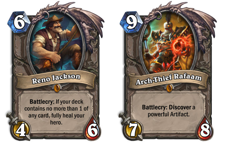 Por otro lado, encontramos cartas que, por decirlo de manera criolla, la rompen. Por ejemplo, Reno Jackson restaura la vida completa de tu héroe si no hay cartas repetidas en tu mazo. Y, pensando rápidamente, se me ocurre utilizarla en mazos brujo, robar muchas cartas, que nuestro adversario gaste las suyas tratando de neutralizarnos, y cuando estamos al límite de la derrota, aparece Reno para salvarnos las papas, mientras que nuestro enemigo ya no tiene prácticamente nada, y esto es solo un ejemplo rápido que se me ocurrió mientras escribía. Otra que carta que me parece infaltable es Antorcha Olvidada, que por dos cristales más de maná que Bola de Fuego (4) inflige 9 de daño.